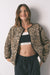 Reversible cropped jacket with a leopard print on one side and a solid color on the other, featuring animal print details. It's made with a double layer of fabric: one layer is super-soft quilted material, and the other is textured sherpa. It's incredibly warm and cozy. Pair it with pajamas from the collection to maintain your style at home or in your everyday looks.