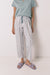 Carrot- fabric long trouser in 100% cotton with an allover border and striped print . Featuring a ruffle detail at the top of the waistband. Ideal for casual, comfortable looks.