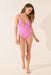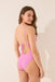 Deep-cut swimsuit in pink seersucker-effect fabric with a low-cut back. Pair it with the matching beachwear for an incredibly ideal beach or poolside look.