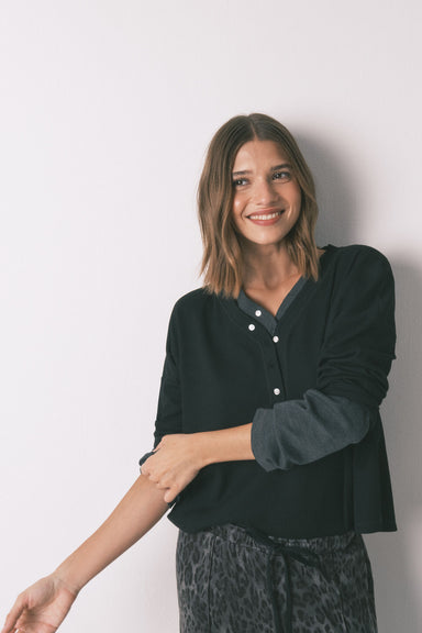 Loose-fitting, plain, long-sleeved T-shirt in super-soft knit fabric. Polished crew neckline with matching piping and center placket fastened with ...