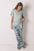 Short sleeve pyjamas set with long trouser made of viscose satin. Plain top with a V neckline and contrasting buttons slit , dropped shoulders, side slits at the hems, and a longer back hem . Lounge trouser with an allover fleck print and an elastic waistband with a matching drawstring. Ideal for sleeping or lounging around the house in comfort and style.