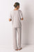 A loungewear set with flowing sleeves and long pants in a plain brushed ribbed fabric. The top features a polished V-neckline with a matching piping, raglan sleeves, and a gathered hem to give the top a slight flare. Lounge pants feature an adjustable elastic waistband with a matching drawstring. Ideal for sleeping or comfortable loungewear.