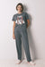 - Top with a round neckline, dropped sleeves, and a raised print in the center.